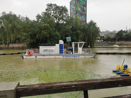 公司研發(fā)的加壓控藻船,以玻璃鋼船體為平臺(tái),配置藍(lán)藻打撈、壓力控藻和曝氣裝置...